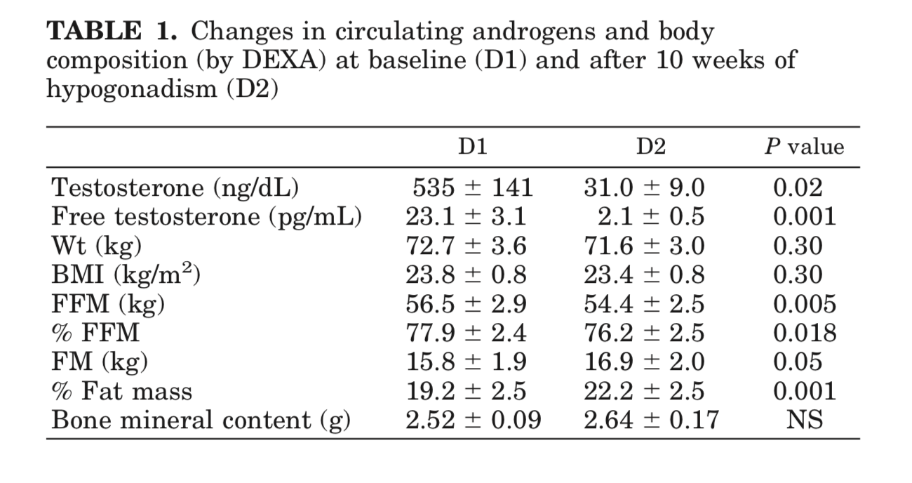 This paper was the first that I found that really illustrated that suppression of testosterone down to levels that people on an antiandrogen often seek. You can see that fat free mass (bone and muscle mass) decreases while body fat percentage increased.